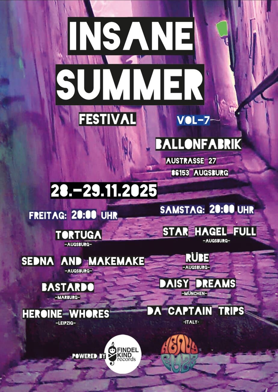 Tortuga ist am 28. November 2025 im Zuge des zweitägigen Insane Summer Festival (ehemals Indian Summer Indoor Festival) in der Ballonfabrik Augsburg zu sehen. Wir spielen am Freitag ab 20:00 Uhr.